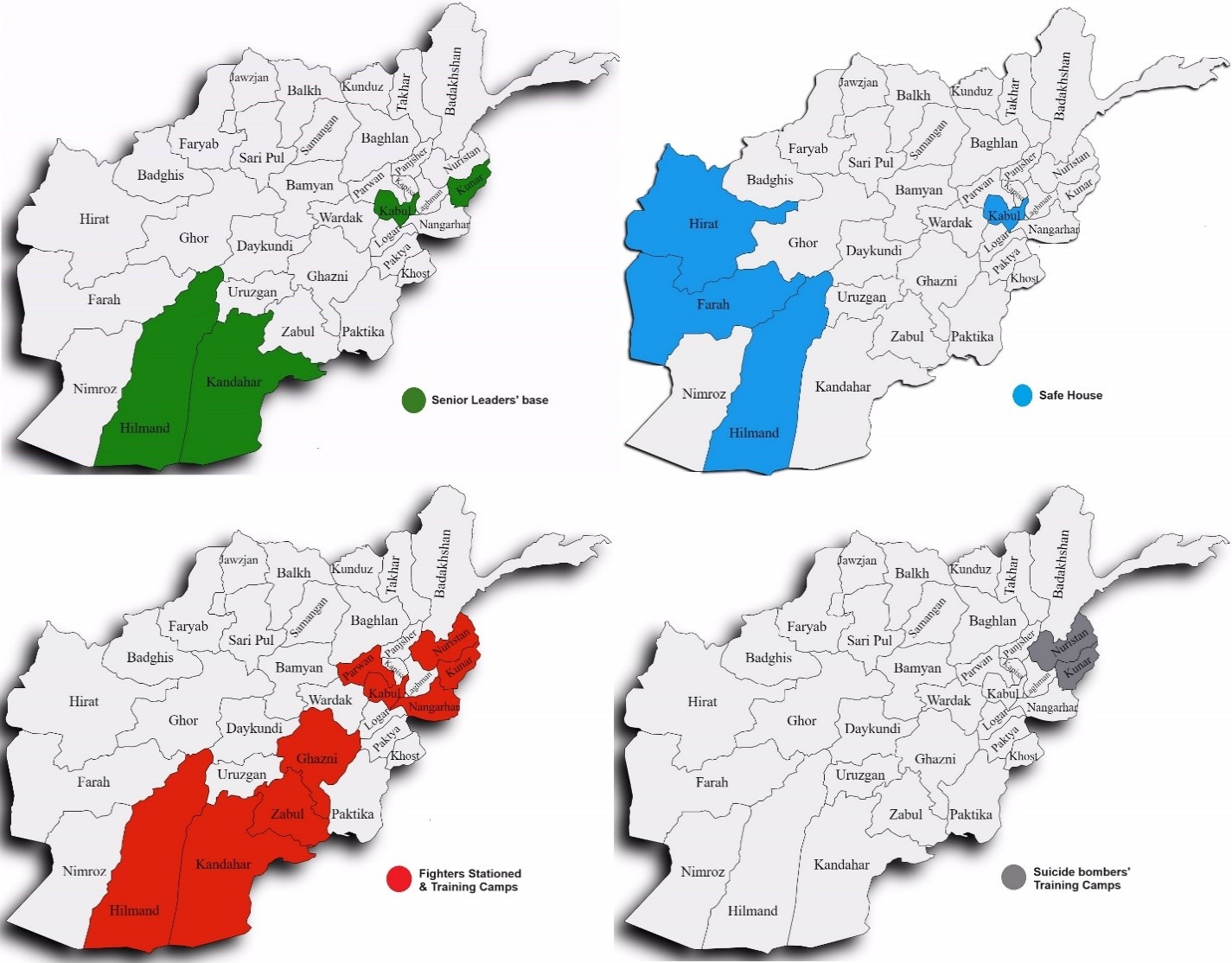 Figure 3: Mapping Al Qaeda's Senior Leaders' Bases in Green; Safe Houses in Blue; Fighters Stationed and Training Camps in Red and Suicide Bombers’ Training Camps in Grey